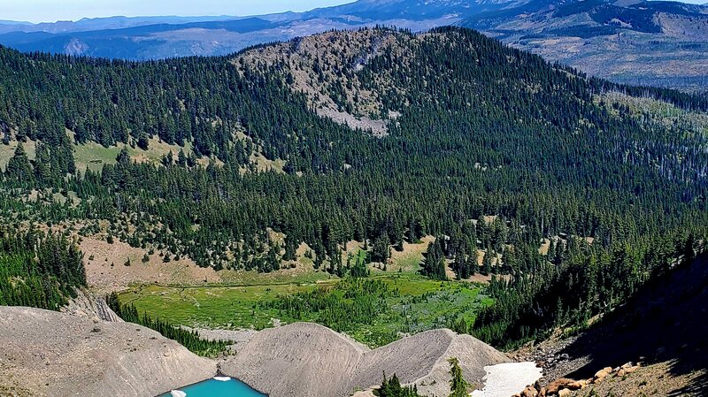 Past the four lakes walking toward Broken Top, hikers can follow a general topography line on a map and find the other two tarn lakes located just below Broken Top. These two lakes can more easily be accessed by following the path next to the creek which flows into Golden Lake. Both of these tarn lakes are located in a cirque bordered by a moraine. On the lower lake, the beautiful blue water was flowing over the top of the moraine forming a waterfall flowing into the creek below in early August 2025. At other times, the water which flows into the creek comes out of a spring at the base of the moraine. At the upper lake, sometimes the voices of people on the top of the ridge overlooking Broken Top's No Name Lake can be heard, although they are not seen due to obstruction from topography and vegetation.