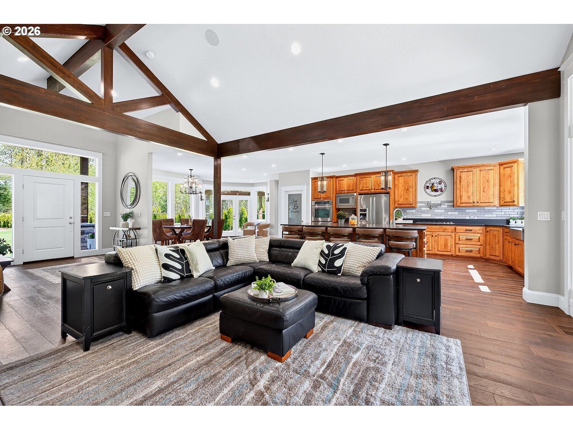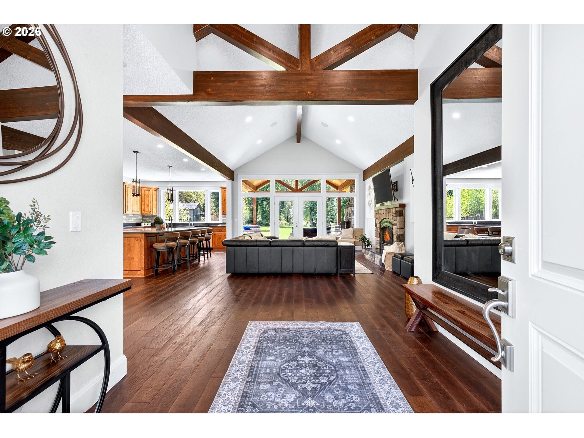 Tucked behind a gated entrance along the tranquil banks of Cedar Creek, this custom-built estate anchored by a picturesque pond offers a truly distinctive setting. Step into an open-concept design filled with natural light, soaring vaulted ceilings, exposed architectural wood beams, espresso-stained white oak hardwood floors, and a stone surround fireplace. The Chef's kitchen is designed for both daily living and entertaining, showcasing custom knotty alder cabinetry, seamless quartzite slab island, leather granite countertops, double convection ovens, gas range with pot filler, farmhouse sink, second prep sink, dual drawer refrigerators, and a large walk-in pantry. The primary suite features a jetted tub beneath a picture window, an oversized tile walk-in shower, dual vanities, and a spacious walk-in closet with built-ins and closet dresser, and additional laundry hookups. A second ensuite offers flexibility for guests. The third bedroom is complemented by a finished bath with custom cabinetry and stone surfaces. Outdoor living is elevated with both covered and open patio space, featuring tongue-and-groove knotty pine ceiling, wood-burning fireplace, and propane hookup for outdoor cooking. The grounds are thoughtfully designed, featuring a private pond, mature landscaping, fenced garden, fruit trees, and established arborvitae hedges for privacy. Direct Cedar Creek frontage includes both banks and the creek bed with trout fishing. A detached casita perched above a private garage with storage, bathroom, kitchenette, and a balcony overlooking the creek, is ideal for guests, private studio, or multigenerational living. Additional highlights include a three-car garage with convenient half bath, circular paved driveway, and secure gated entry. Close to downtown Sandy along the Mt. Hood corridor, just minutes from world-class skiing, hiking, and year-round recreation, this is a rare opportunity to own an immersive retreat designed for elevated Pacific Northwest living.