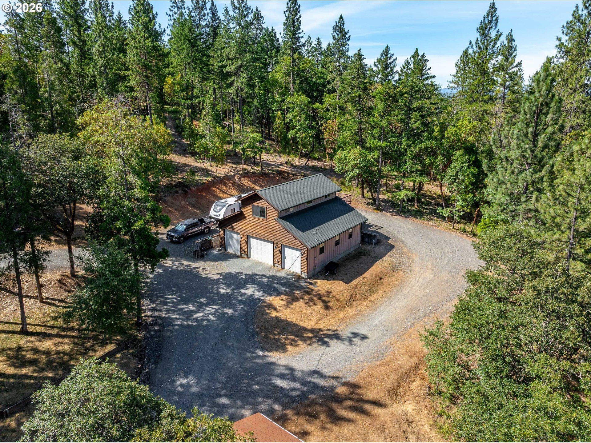 Nestled in the highly desirable Merlin/Hugo area, this beautifully updated 2-bedroom, 2.5-bath home offers the perfect blend of rustic charm and modern comfort. With cozy mountain vibes throughout, you'll love the warm, inviting feel from the moment you step inside. The spacious open-concept kitchen is ideal for entertaining, featuring plenty of room to gather with friends and family. Step outside to enjoy the peace and privacy of over 5 acres, complete with a seasonal pond and a large above-ground pool surrounded by a stunning custom deck, perfect for summer relaxation. Need space for hobbies or guests? The impressive 3-bay shop includes 1,440 sqft of unfinished living quarters above, offering endless possibilities. There are also multiple outbuildings for storage, plus ample RV parking. The current owners have poured love into the land, investing time and care into landscape maintenance and tree preservation, creating a park-like setting that feels like a retreat.